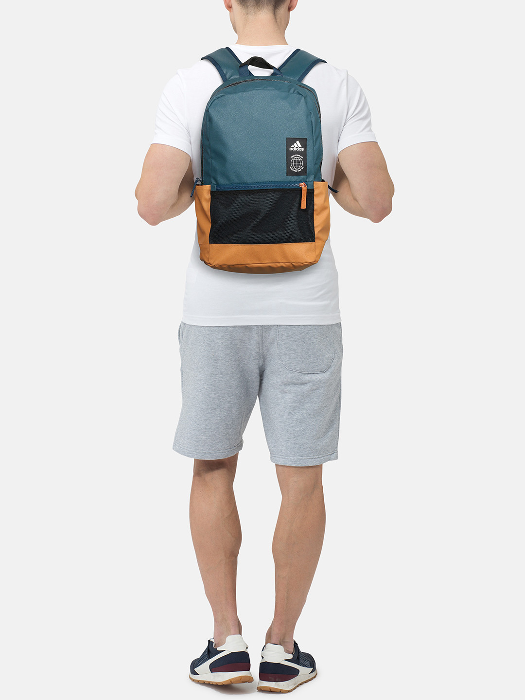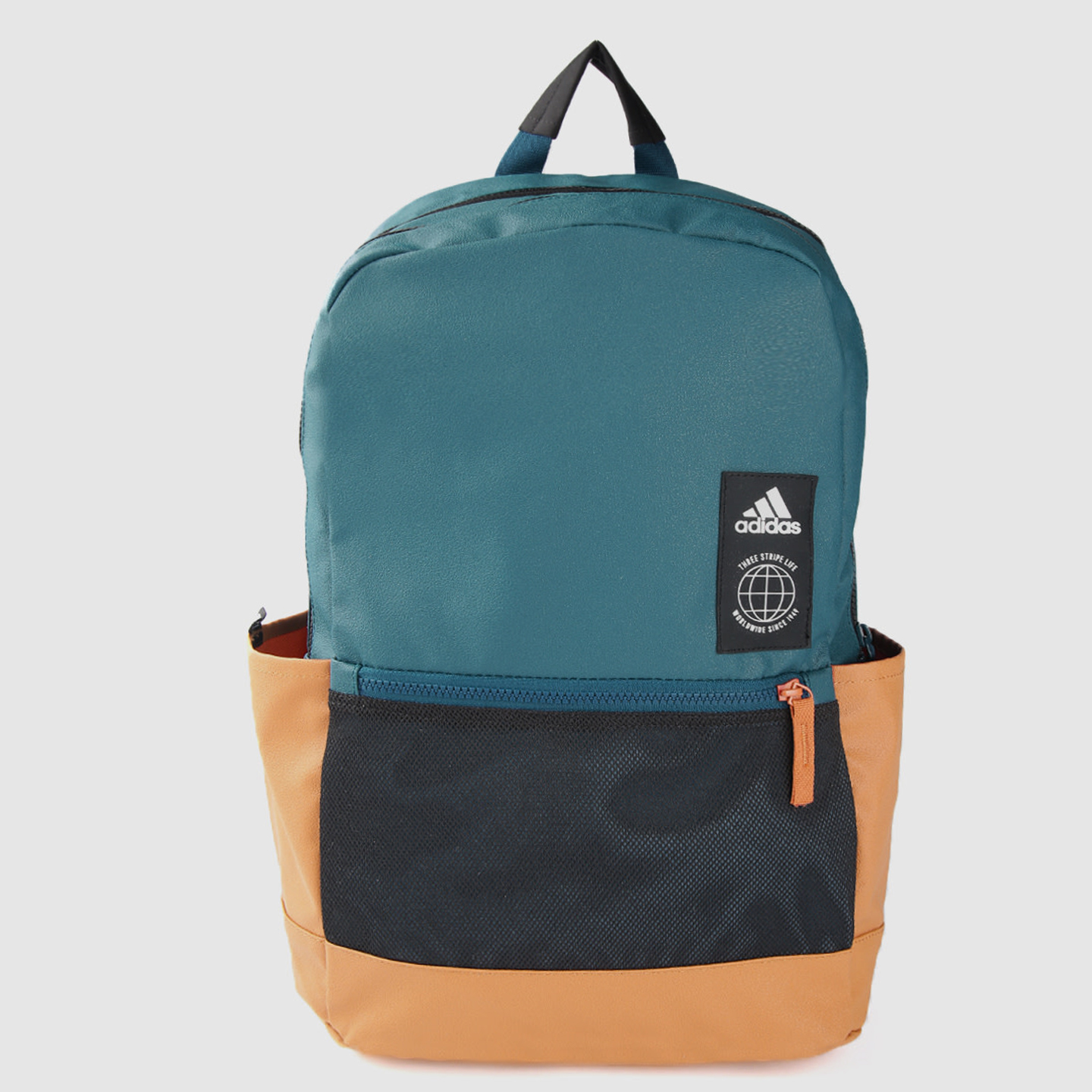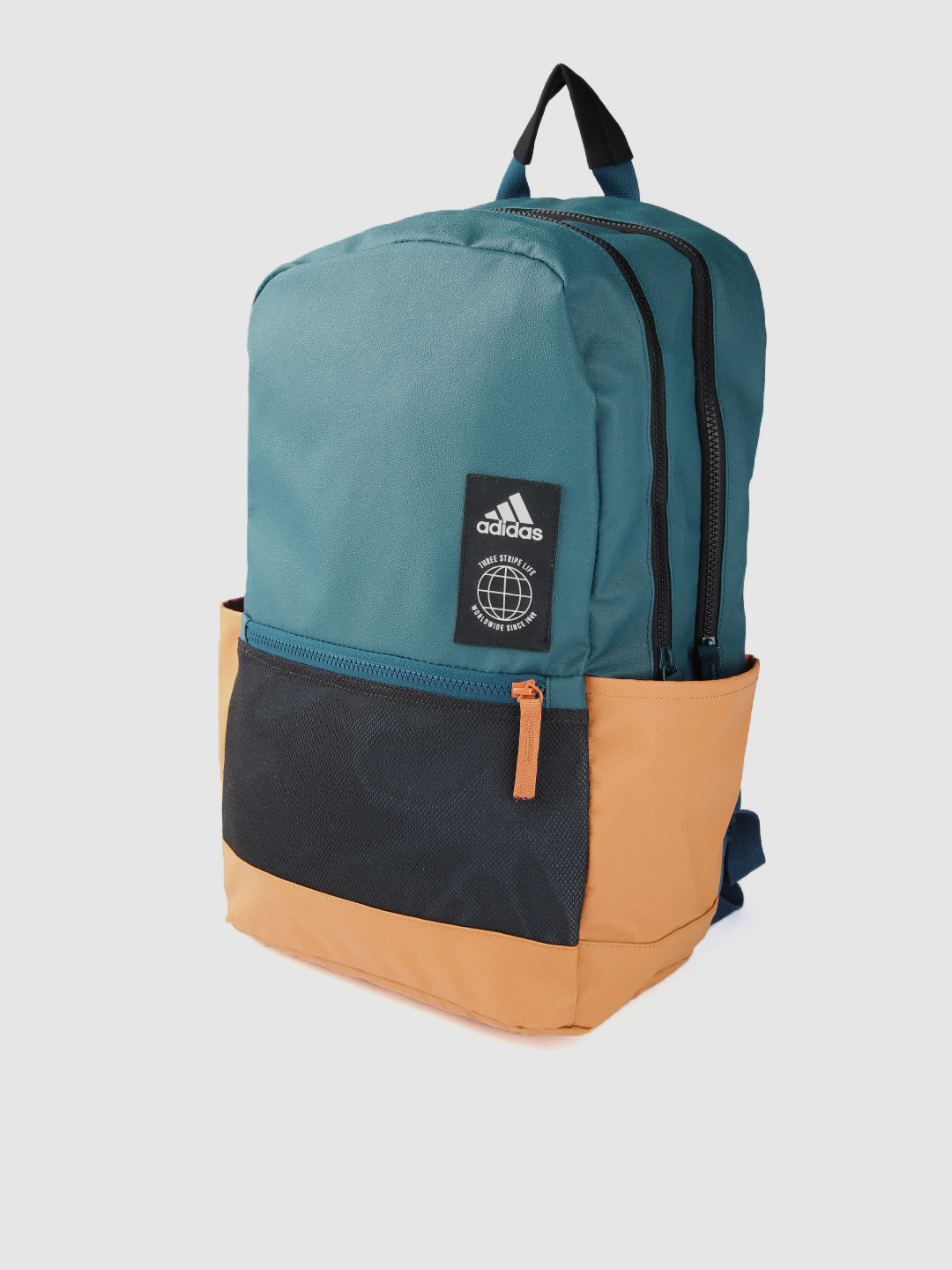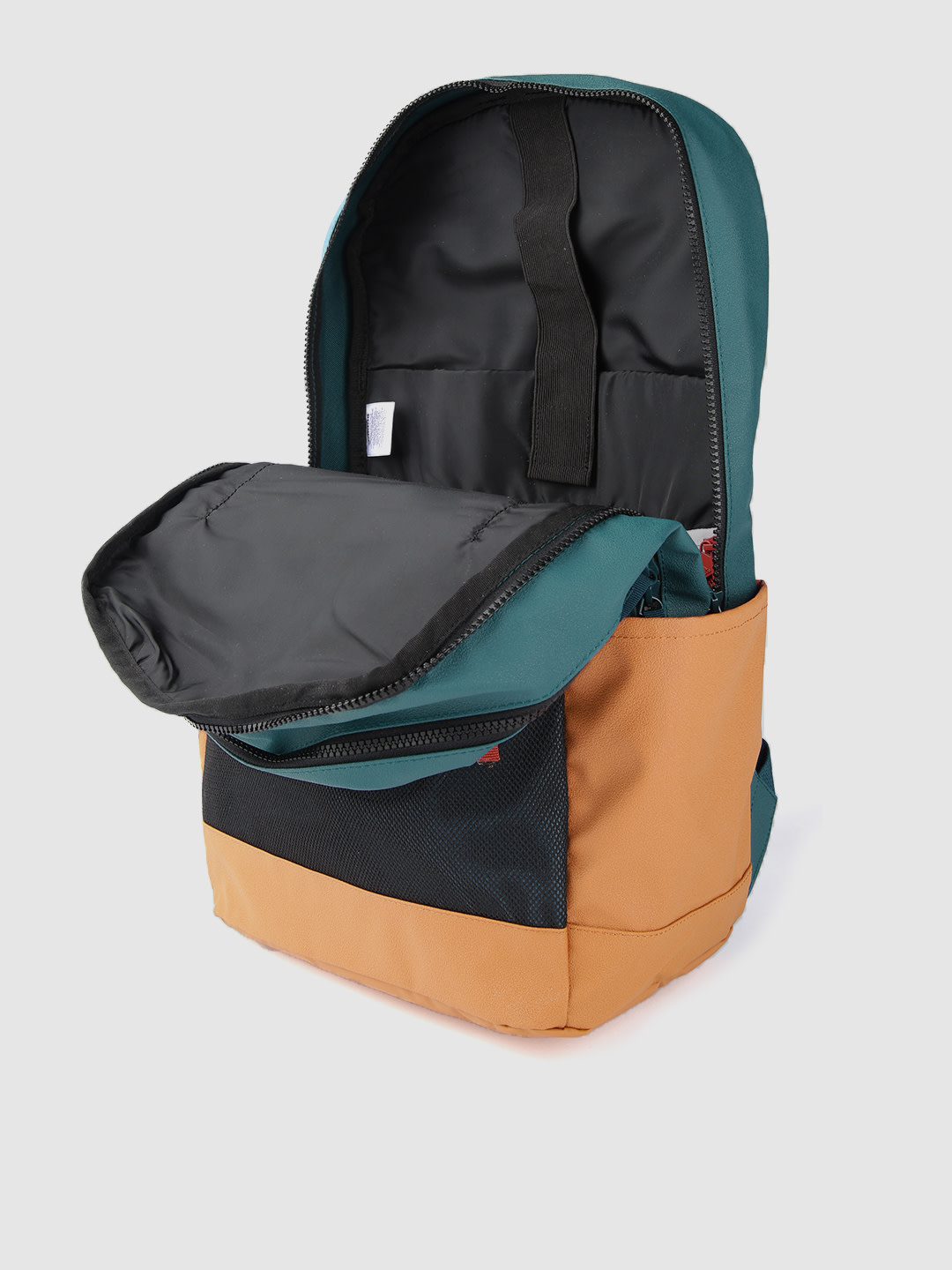 Teal blue, black and mustard yellow colourblocked laptop backpack